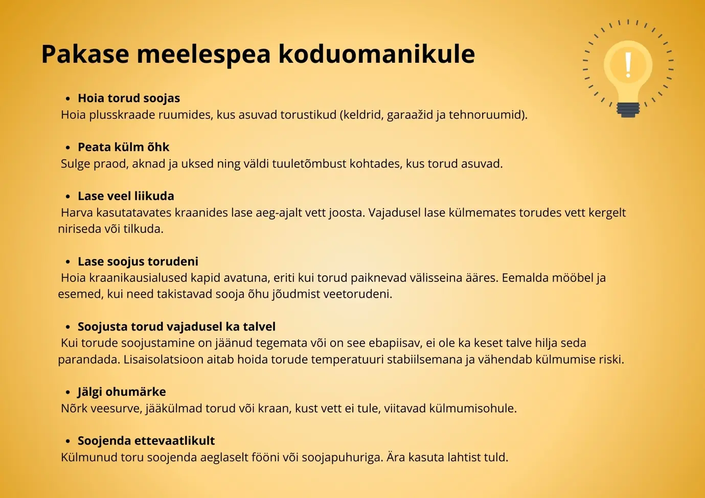 Praegu, kui Eestis püsivad külmakraadid kümne ja enama miinuskraadi juures, on veetorustik eriti haavatav. Pikalt kestev pakane, jahedad ruumid ja harva kasutatavad veetorud loovad olukorra, kus külm võib torudeni jõuda märkamatult. Kui probleem avastatakse alles siis, kui kraanist enam vett ei tule või ilmneb veeleke, on kahju sageli juba tekkinud.